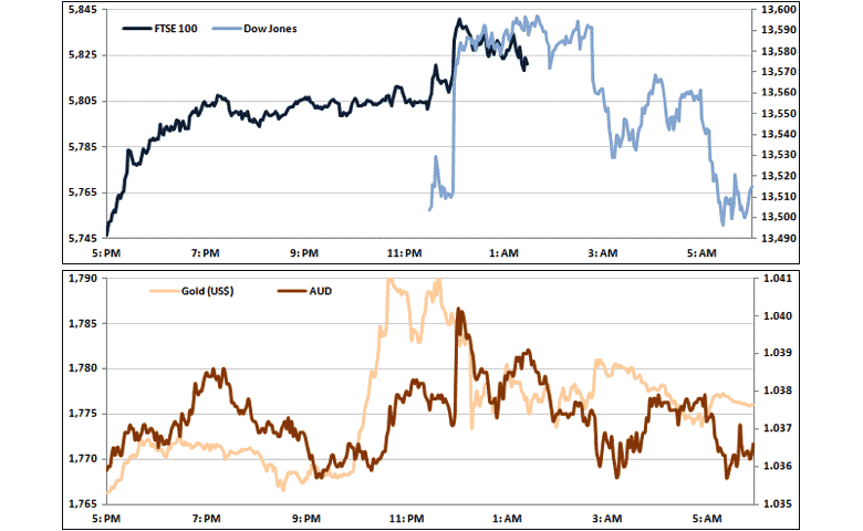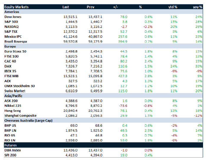 - FTSE 100: Up 1.37% (or 78.38 points) to 5,820.45. European markets noted their strongest one night gain in recent weeks overnight as better than expected U.S. data boosted investor sentiment. The banking sector was notably higher with RBS, Lloyds, HSBC and Barclays gaining between 2.5% and 3.7% respectively. Additionally, heavyweight mining companies rose with BHP and Rio gaining 2.6% and 1.8% respectively. Fresnillo, Kazakhmys and Randgold Resources followed higher. Xstrata gained 2.4% after the Board recommended the revised Glencore offer. Lastly, energy companies BG Group and Shell gained 2.3% and 0.9% respectively.