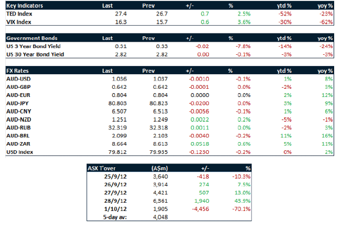 - DOW JONES: Up 0.58% (or 77.98 points) to 13,515.11. Markets across the U.S. gained overnight on upbeat manufacturing data, but pulled back from session highs as Bernanke spoke about the Fed’s decision to launch QE3. In economic data, the U.S. ISM manufacturing index rose 51.5 last month from 49.6 in Aug’12, the highest reading since May’12 and an unexpected return to expansion. Additionally, the Commerce Department reported that construction spending fell 0.6% in Aug’12, well below the 0.5% gain expected. 26 companies gained with 7 topping 1%. The financials had a strong run with American Express and Bank of America gaining 1.5% each. The notable fallers included Caterpillar and Microsoft.