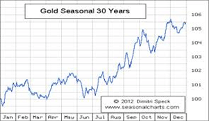 First. Gold has some long term seasonal influences . This graphic courtesy of Dmitri Speck suggests that from September until December an average seasonal move of about 3% could be expected. So after this seasonably sharp early September decline we could see US$30-50 rise by Christmas. On average. Pity this graphic didn’t include the 2013-2014 volatility. But it is what it is and it is helpful.